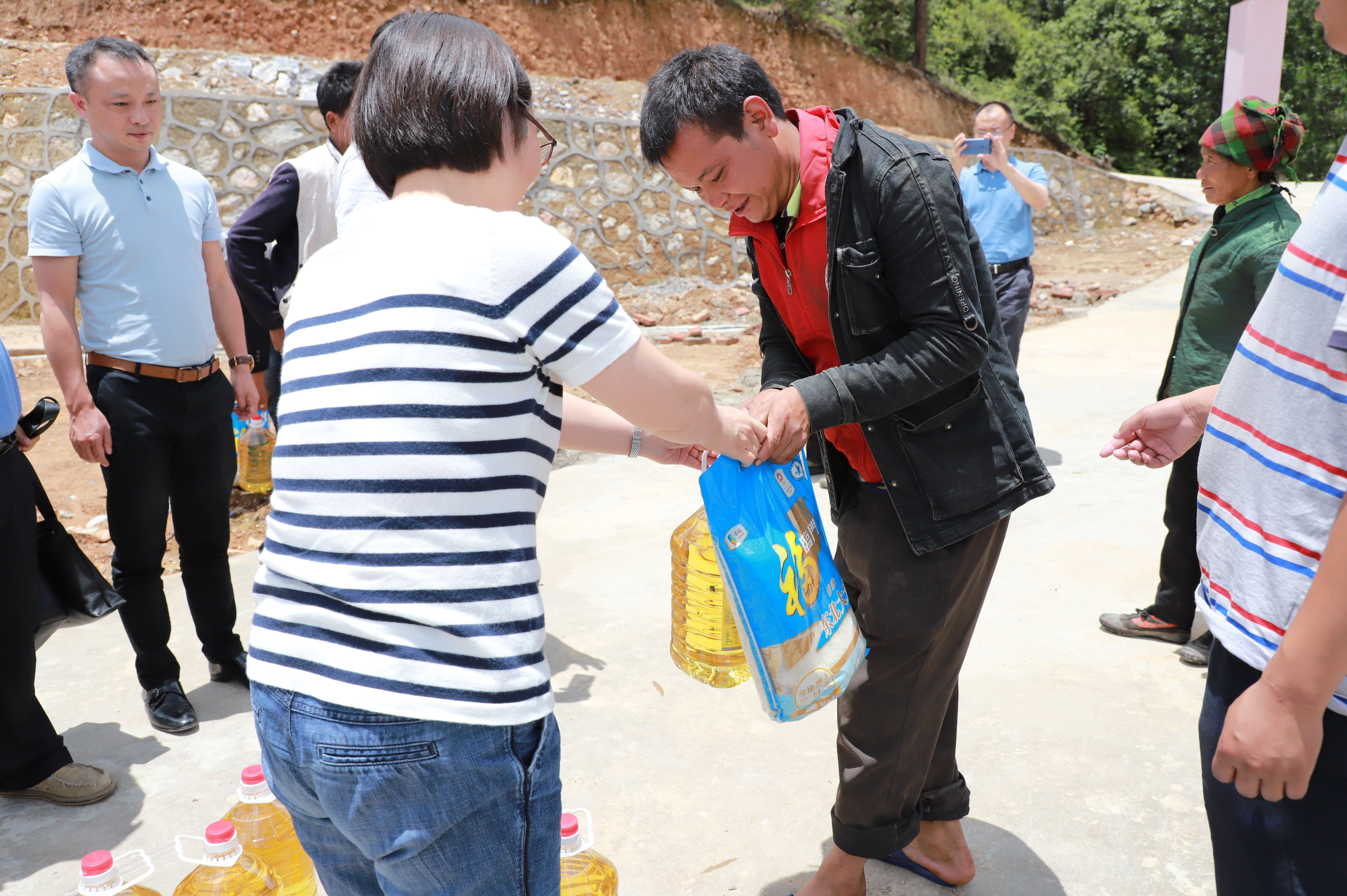 最后,慰问组向28户建档贫困户、一户特贫人员分别送上米、油等慰问品。