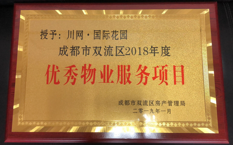 2019年1月15日,双流区房管局召开“2018年物业管理工作总结会暨年度表彰大会”,会议对2018年度物业服务暨城乡环境综合治理十佳物业服务企业、优秀物业服务项目、优秀物业服务项目经理等评定情况进行了通报,佳友物业川网国际花园项目获得“2018年度优秀物业服务项目”、项目副经理陈文利获得“2018年度优秀物业服务项目经理”。报成都市房管局记加信用分10分以兹鼓励。
