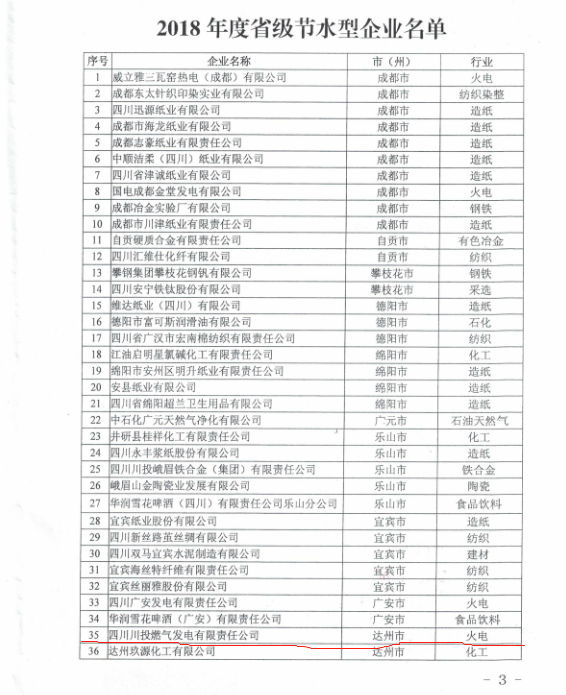 为促进四川省工业领域节约用水,由四川省水利厅、四川省经济和信息化厅共同组织对四川省火电、钢铁、纺织、造纸、石油炼化5大行业规模以上企业开展了“2018年度省级节水型企业”的评选活动。经专家评审和现场核验,最终评选出41家节水型企业,川投气电公司名列“2018年度省级节水型企业”榜单。
