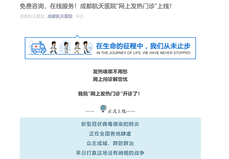 截至目前,开发的网上发热门诊已在四川省护理职业学院附属医院、成都市第三人民医院、成都航天医院等多家医院推广应用,另有多家医院正积极筹备开通。