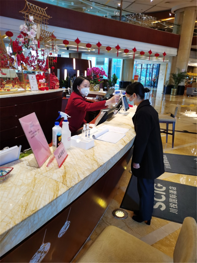 在四川还未出现首新型冠状病毒感染时,前厅部就召开了部门紧急会议预警防控,重点防控,提前准备了重要的防疫物资,口罩、消毒酒精、板蓝根冲剂及应急医疗箱,每天免费为员工及客户提供口罩、消毒液等防护物资。前厅部要求部门提高警惕,严控出入,准确检测,在东大门设立体温测量点,部门员工上岗前必须进行体温测量,如实登记《前厅部在岗员工体温监测表》。前厅部要求既确保证服务质量,又广泛宣传疫情,对所有的进店客人,都由礼宾或者前台员工对其进行体温测量与疫情防控的信息询问。在疫情逐渐严峻的情况下,前厅部门员工们张贴告示,不厌其烦地对来往客人进行温馨提示,始终把最可爱的微笑留客人,把最好的防护物资优先提供客人,口罩始终先发厚款,再发薄款,消毒水始终备足。 疫情牵动人心,但前厅部那群可爱的人始终坚守岗位,认真热忱,为疫情阴霾中的人们带来了动人的暖意。