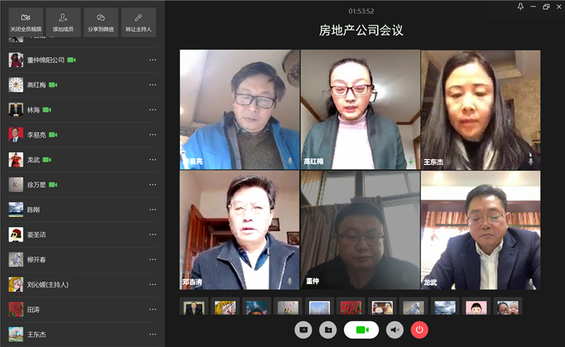 网络视频会议,科技的力量不是要改变世界,而是在环境改变的时候能够从容应对。房地产公司领导班子带头试行网络办公,积极组织相关人员召开各类视频会议,强化现阶段各单位沟通,以最快速度掌握疫情形势下公司现阶段工作难点和痛点,积极谋划应对方策。2月17日,召开了共17人参加的网络行政例会,董事长高红梅安排部署了七项重点工作;2月18日,公司领导班子带头和员工参加了疫情对房地产企业的影响及对策专题培训;2月19日,召开了共15人参加支委会和总经理办公联席会议,通过了七个议案,并安排了近期重点工作。