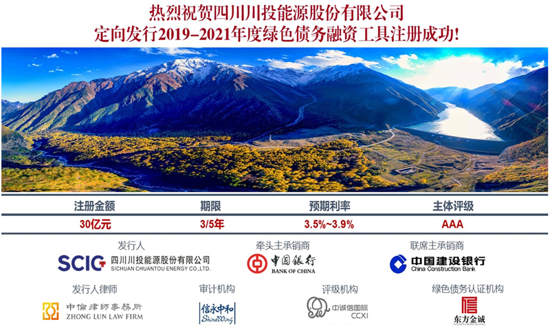 近日,川投能源迎来“定向发行2019-2021年度绿色债务融资工具”注册成功的好消息。本次私募债注册金额30亿元,公司可在注册额度内分批次或一次性发行,募集资金将定向用于公司投资的绿色项目建设,期限3/5年。此次为川投能源首次成功注册私募债绿色债务融资工具,牵头主承销商为中国银行。私募债发行利率将根据发行时的市场情况确定,预期在3.5%-3.9%之间(3-5年期限),远低于同期限银行贷款基准利率。