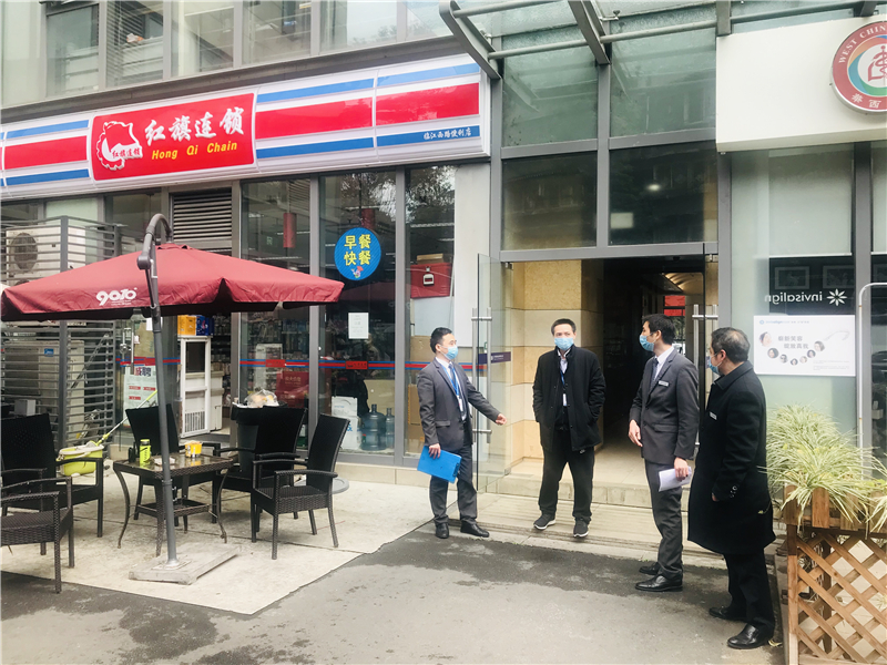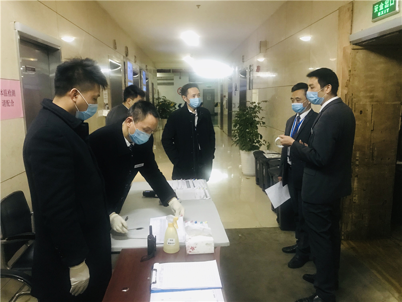 成都已逐渐由“全民宅家”的慢生活切换到生产、生活逐渐步入正轨的快节奏,随着川投大厦内各单位的陆续复工,人流密集、“扎堆”8小时的商务写字楼的疫情防控工作进入关键期,佳友物业作为防疫工作战斗第一线,员工个人防护情况及如何降低一线员工防疫职业风险,避免发生战“疫”能力减退,以及战“疫”减员情况发生,同时如何强化防疫管控关键点,是川投佳友物业防疫领导小组对川投大厦新一轮防疫工作的牵挂重点。2020年2月28日上午,川投佳友物业董事长、总经理王宾率队对川投大厦疫情防控工作以及员工个人防疫防护工作进行督查。川投大厦物业服务中心项目总经理邓正、经营管理部副经理郭婧陪同检查。