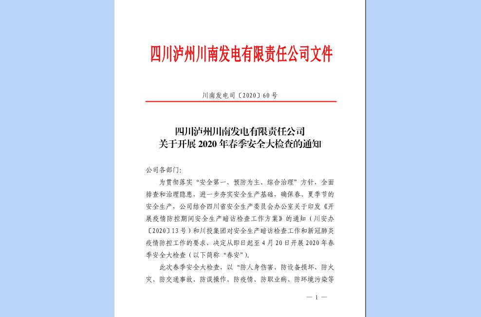 为落实省安委会和米兰(中国)关于开展安全生产暗访检查工作要求和新冠肺炎疫情防控工作要求,贯彻“安全第一、预防为主、综合治理”方针,进一步夯实安全生产基础,切实做到春、夏季节公司安全生产稳定,3月4日,川南发电公司印发《关于开展2020年春季安全大检查的通知》,标志着2020年度春季安全大检查正式启动。