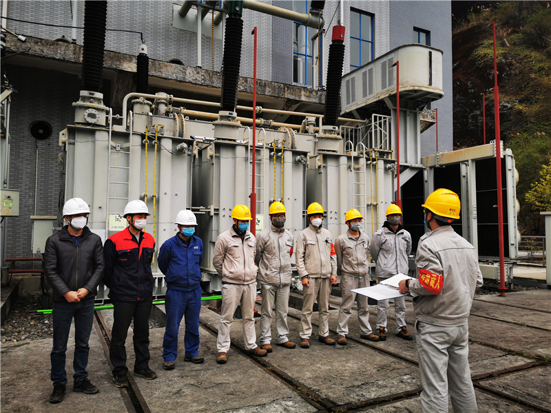 在互感器吊装过程中,起重机安装在1#主变和2#主变之间,互感器安装位置在距地面约12米高度的位置,起重机司机和地面指挥人员在豪厘之间通力配合,精准操作。实验过程中,检修人员认真核对图纸,严格按照实验规范进行分部施工,专职安全员全程监督,严防施工人员走错带电间隔。
