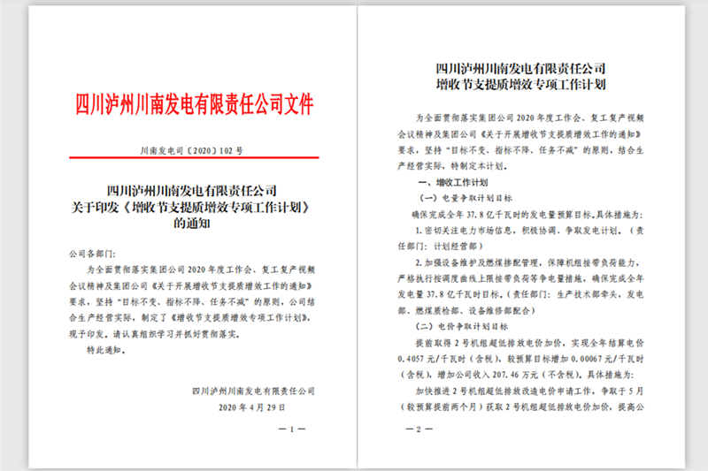 为全面贯彻落实集团公司2020年度工作会、复工复产视频会议精神及集团公司《关于开展增收节支提质增效工作的通知》要求,4月29日,川南发电印发实施了《增收节支提质增效专项工作计划》,对公司增收节支提质增效重点工作进行了安排部署。