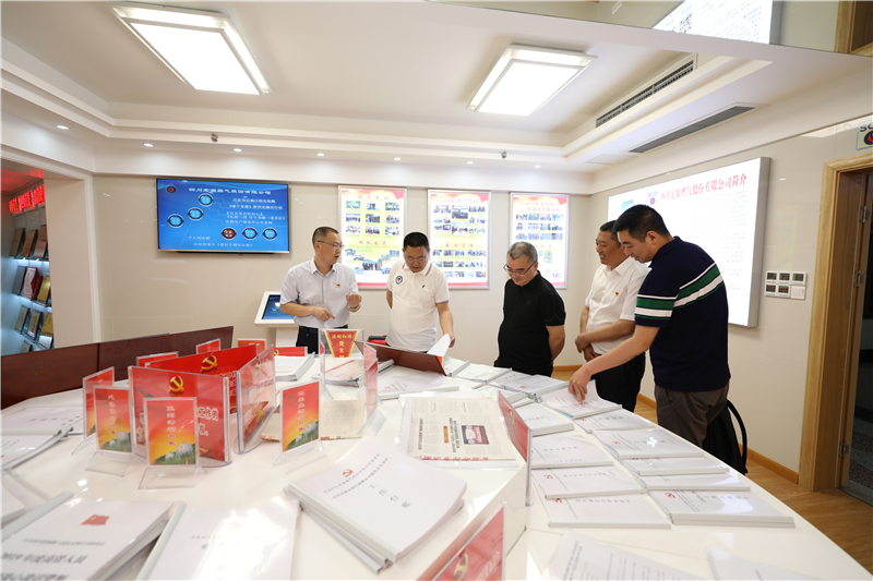 上午,赵矿长一行参观了4楼走廊文化建设、电梯文化建设、“家事国事天下事”“历史上的今天”等党建文化阵地,来到4楼党群文化中心,公司党委书记、总经理李旭东向赵矿长一行详细介绍了公司党建工作基本情况和8个组织各自的特色亮点工作,介绍了公司各支部、各部门近期开展的“统筹疫情防控、生产经营和党的建设恳谈活动”等情况。公司党委近年来深入学习宣传贯彻习近平新时代中国特色社会主义思想融入日常、抓在经常,并通过学习《习近平新时代中国特色社会主义思想学习纲要》《习近平关于“不忘初心、牢记使命”重要论述选编》等书籍、党员人人背诵“党的基础知识14项”、30岁以下青年员工每天坚持书法练习等方式,增强“四个意识”,坚定“四个自信”,做到“两个维护”,更好地促进了企业发展。