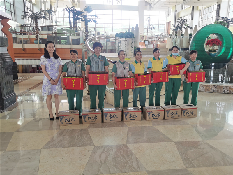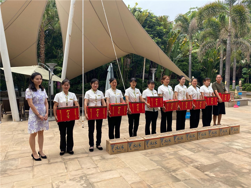 朱莉先后来到酒店综合区、园林区与温泉区为大家送去了防暑降温用品。在慰问过程中,朱莉董事长对员工在烈日下仍坚守岗位、认真工作的精神给予肯定和表扬,同时叮嘱员工们一定要注意防暑降温,备足药品,加强自身安全意识,注意高温天气劳动保护,并希望大家以饱满的状态努力工作,以奋进的初心再接再厉。她表示,高温气候期间,酒店还需强化对顾客的防暑降温服务,完善防暑预案,做到体贴入微、深入人心。