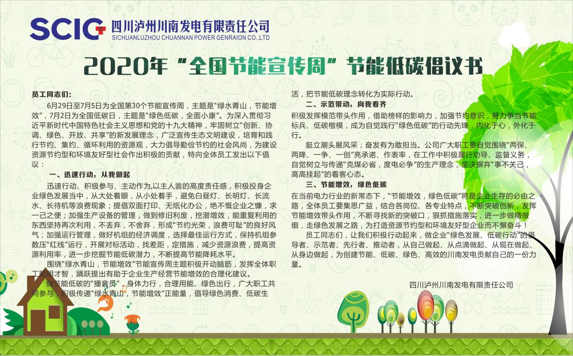 节约能源、提高能源利用率,既是保障企业正常生产经营,实现公司健康可持续发展的长久之计,也是企业适应市场需要,降低成本、增加效益、改善环境,提高企业竞争力的必然选择。为深入贯彻习近平新时代中国特色社会主义思想和党的十九大精神,牢固树立“创新、协调、绿色、开放、共享”的新发展理念,川南发电公司认真落实《关于开展2020年全国节能宣传周和全国低碳日活动的通知》(发改环资〔2020〕920号)要求,研究制定了《2020年节能宣传周和低碳日活动实施方案》,通过多种形式,开展了节能低碳的宣传和教育活动。一是在生产例会上,公司领导部署了节能低碳的具体工作,要求公司各部门组织员工认真学习国家有关节能的法规、政策,做好贯彻;号召全体职工争做企业“绿色发展、低碳行动”的倡导者、示范者、先行者、推动者,从自己做起、从点滴做起、从现在做起、从身边做起,为创建节能、低碳、绿色、高效的川南发电贡献自己的一份力量。二是公司节能办公室向全体员工及外委单位发出了《2020年“全国节能宣传周”节能低碳倡议书》,利用公司内网平台、微信公众号、宣传栏等进行节能法规、知识的宣传;对公司生产现场和办公场所节能工作进行了检查,要求各部门加强对职工节能意识的教育,认真落实公司制度,切实把节能工作落到实处。三是生产技术部、发电部、设备维修部等部门结合自身实际开展了节能、低碳大讨论活动。