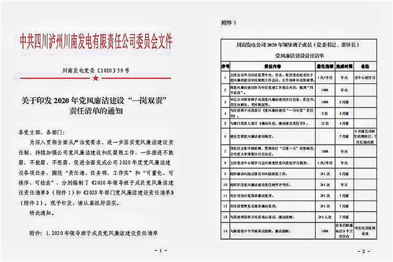 按照以岗定责原则,根据《川南发电公司落实党风廉洁建设责任制情况考核评分细则》,以签订的《经营班子成员党风廉洁建设“一岗双责”责任书》和《部门廉洁从业、廉洁建设责任书》为基础,针对不同岗位和不同分工进行责任分解,细化编制党风廉洁建设工作清单。领导班子成员的清单任务从16项至30项不等,部门的清单任务从12项至15项不等,从组织领导、宣传教育、作风建设、监督检查等方面,列明公司领导班子成员、各部门负责人的年度党风廉洁建设具体任务、指标和完成时限,做到任务清、责任明,突出可量化、可操作、易执行。