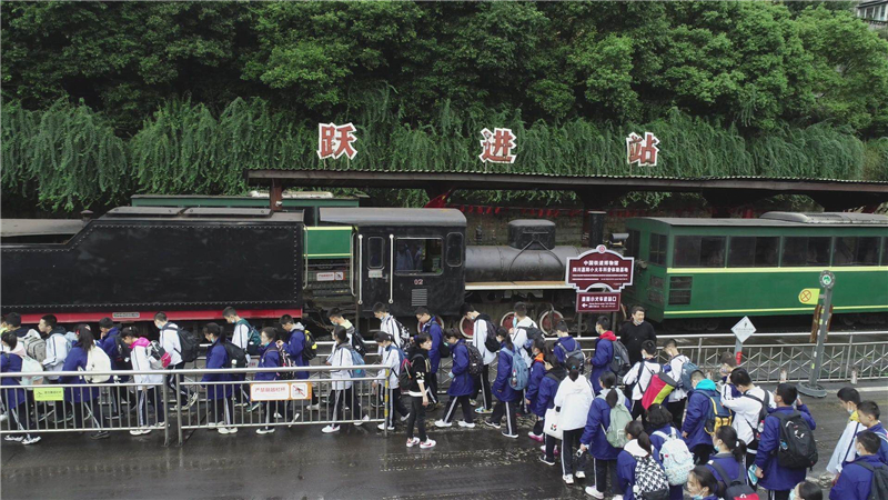 同学们瞻仰嘉阳煤矿创始人铜像,阅读嘉阳赋,感怀着前辈们的英勇无畏,赞叹着时代领袖的眼界和魄力。坐上期盼已久的蒸汽小火车,了解小火车的运作原理,见证了课本里詹天佑先生设计的“人字形”调头,欣赏着由花卉拼接而成的五星红旗,伴着小火车的开动仿佛迎风飘展。