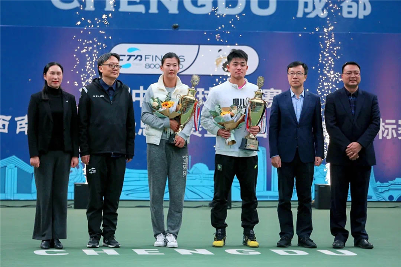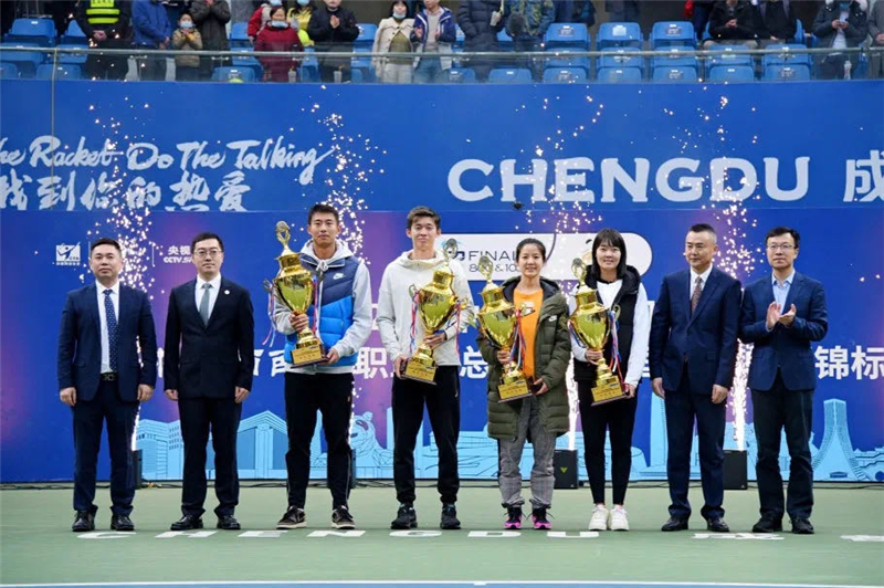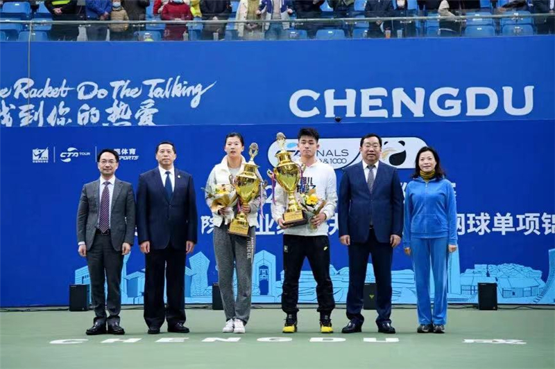 颁奖仪式上,国家体育总局网球运动管理中心主任、党委书记、中国网球协会副主席兼秘书长刘文斌,四川省成都市人民政府副市长王平江为男、女单打冠军吴易昺、刘方舟颁发冠军奖杯。成都文化旅游发展集团有限责任公司党委书记、董事长张斌,成都银行行长王涛为冠军选手们送上鲜花。