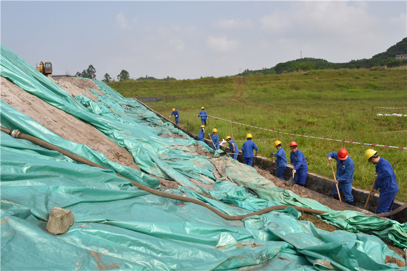 本次演练场景设置为:2021年4月21日上午9时30分,因暴风雨导致公司岩腔湾灰场石膏堆放区边坡发生垮塌,并造成石膏堆放区渗滤液收集沟堵塞,石膏渗滤液无法回收至石膏滤液池,渗滤液、雨水即将漫过石膏堆场周围的绿化草坪至排水竖井,可能造成环境污染,灰场管理站区域停电,需立即组织人员抢险。