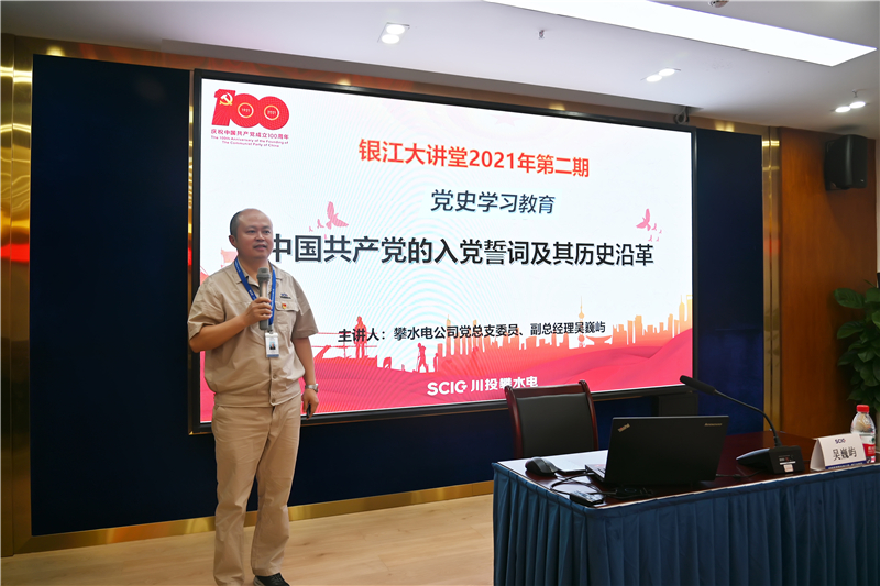 自川投能源攀水电公司“银江大讲堂”开讲以来,一直受到了公司员工和各参建单位的广大欢迎。为持续开展好“银江大讲堂”活动,近日结合党史学习教育主题,开办了党史学习教育专场。党员干部学习积极性高涨,公司全体员工及各参建单位党员代表共40余人参加。