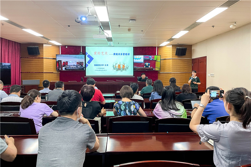 此次培训邀请了西南财经大学沈思教授。沈思以《爱的艺术——家庭关系管理学》为主题,以歌曲《国家》中“家是最小国、国是千万家”为切入点,向全体员工系统阐释了家国同构、经营婚姻、亲子关系、家庭与事业等内容。从理论到实践,从书面到应用,通过丰富的教学案例,幽默风趣的话语,沈思与员工在轻松无压的氛围中,同频共振,同轴共转,让大家深切感受到了家庭和谐与职业发展的密切关系,理解到了正确的婚姻家庭观、子女教育观、职业发展观对家庭和睦、事业顺遂、社会和谐、人类和平的必要性,正如习近平总书记在论述人类命运共同体中提到的“攥指可成拳,合力方致远”。