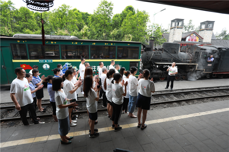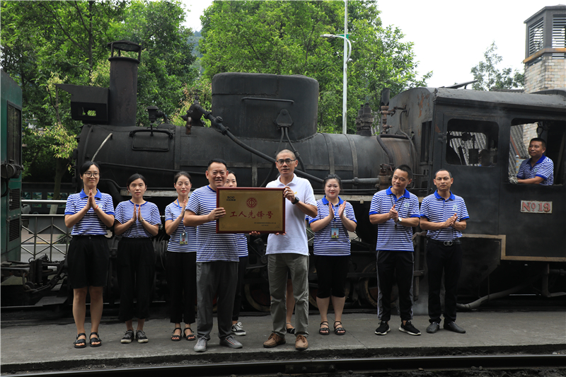 百年窄轨嘉阳蒸汽小火车满挂“开往春天的火车”观光专列稳稳停靠。党总支书记、董事长杜勤,工会负责人罗杰分别受表彰的荣誉集体和个人代表授牌颁奖。