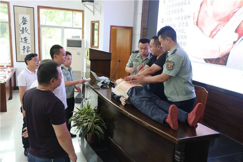 副主任医师宋贤章为大家详细讲解了《中暑的预防和救治》。什么是中暑?中暑的3种症状:先兆中暑、轻度中暑、重症中暑;中暑急救方法“六字诀”:搬、擦、服、掐、转。宋医生还分享了预防中暑的一些生活常识:夏季要保证充足的睡眠、适当饮水补充水分、盐分,注意健康饮食增加营养、备好防暑药品等等。在急救技能演练培训环节,矿山救护队的两位培训教师用人体模型向大家演示了心肺复苏、呛水急救的正确操作手法,并指导大家上手操作。
