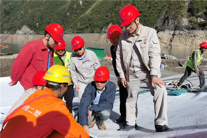 黄维一行首先来到仁宗海大坝施工现场,仔细查看了坝面复合土工膜、两岸帷幕补强灌浆等施工工作,重点检查了土工膜铺设、焊接、锚固等关键工艺流程的作业情况;听取了公司和设计单位关于项目进展情况、设计方案调整的汇报。