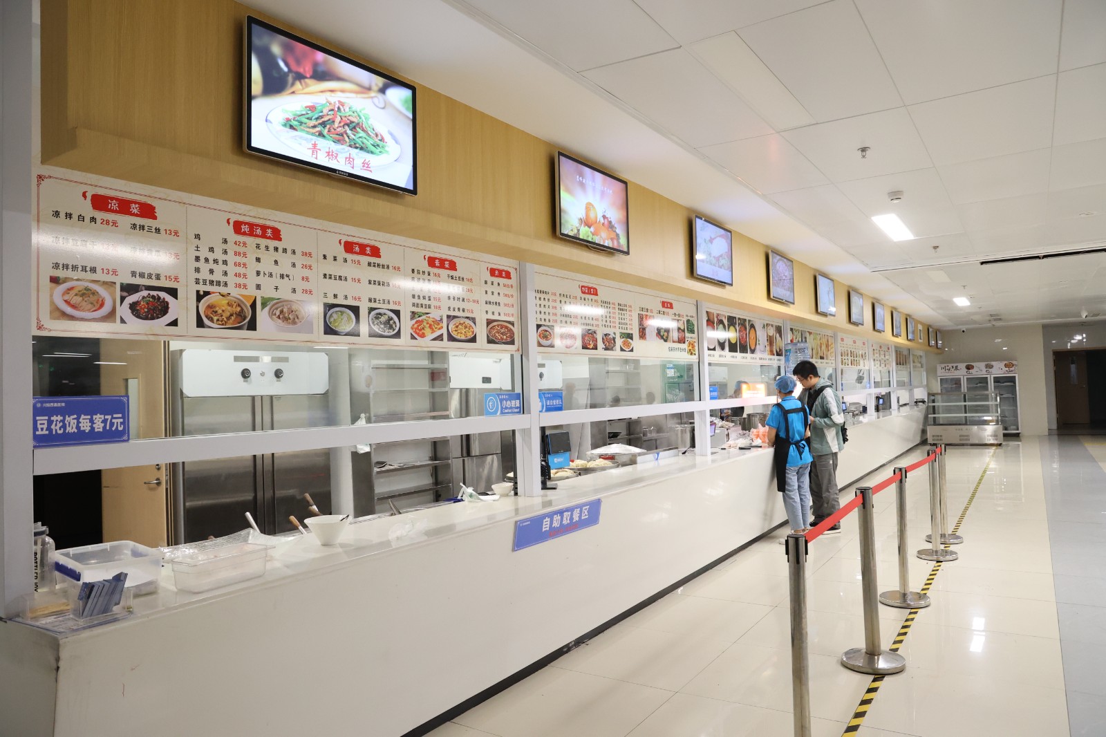 食堂所提供的菜式菜品均参照营养师指导,膳食搭配科学、营养,在保证病(陪)人营养所需的前提下,提供更科学全面的饮食;配餐区划有汤粉包点类、自选餐类、炒(盖)饭冒菜类、小碗菜四个区域,美味可口。每日正餐用餐保证供应不少40于种荤素搭配菜品,包含肉禽蛋瓜茄豆菌菜,烹饪方式以拌蒸煮和快炒为主,控盐控糖,保证营养均衡、多样选择。