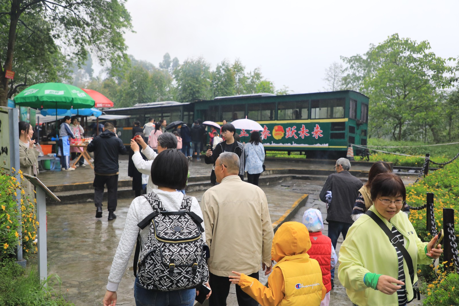 在菜子坝景点,一片木春菊花海映入眼帘,金黄的花朵竞相绽放,构成了一幅美丽的画卷。小火车在此停靠后,大家纷纷拿出手机,记录下眼前的美景。