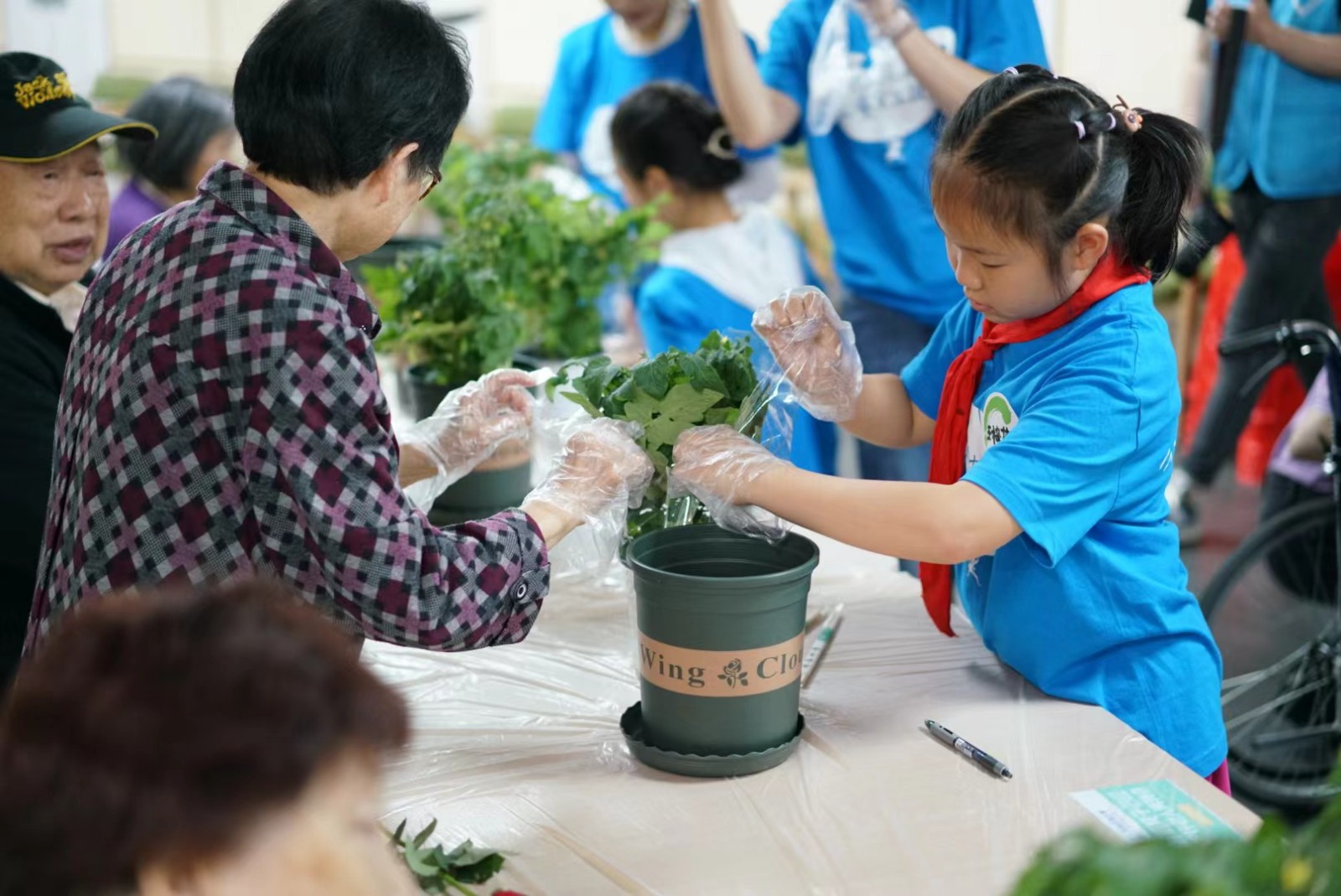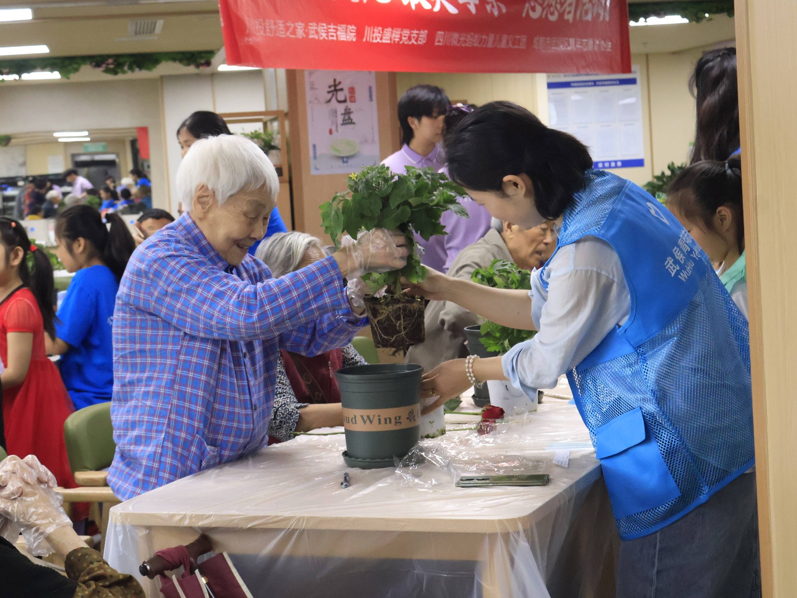 活动上,武侯吉福院的长者们与志愿者们一一结对,共同种下蔬菜盆栽。长者们握着志愿者们的手,对盆栽进行施肥松土,并将祝福贺卡挂在植株上。小小盆栽,寄托着长者与志愿者们共同期待收获的美好愿景。
