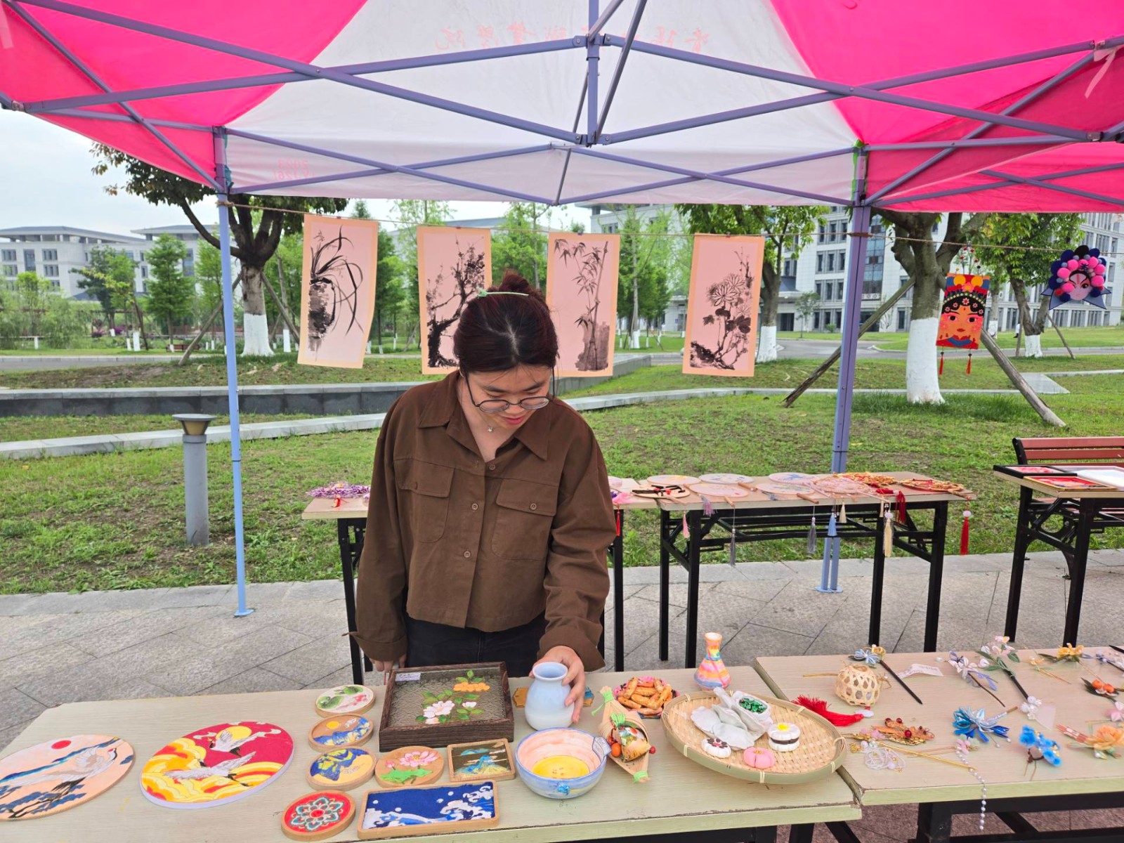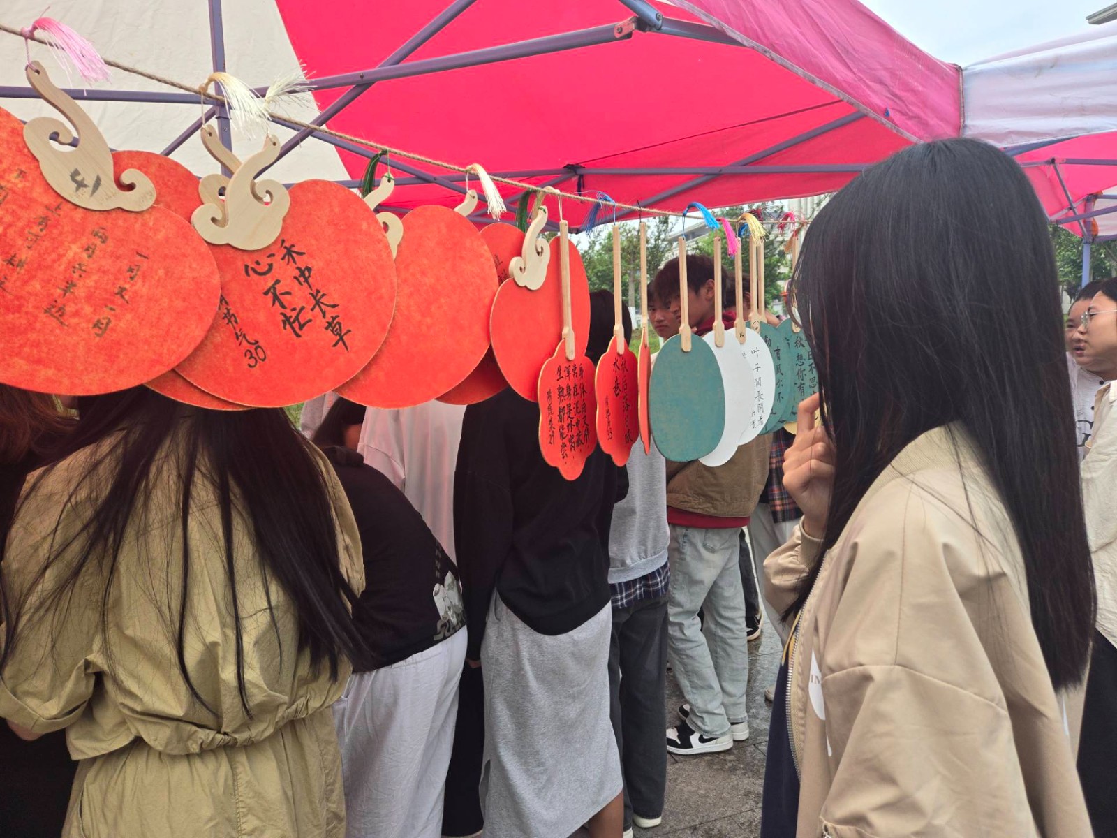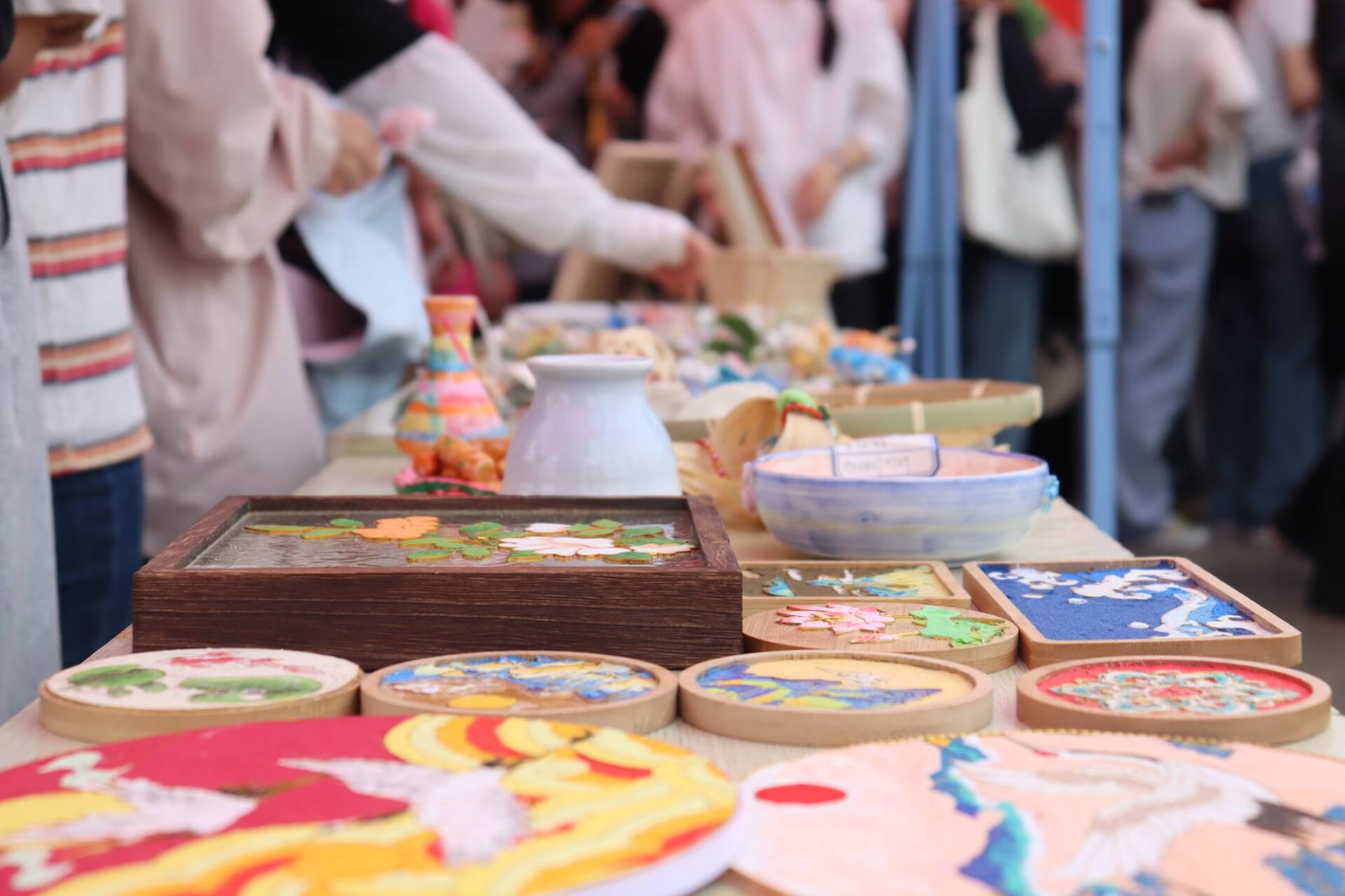 此次活动分为“参观+体验”两个版块,集中展示2023级学生制作关于书画、掐丝珐琅、团扇、竹编工艺、刺绣、花灯的六大作品,设置点茶、拓印、猜灯谜、诗词接龙的文化体验环节,让同学们近距离感悟中华优秀传统文化的魅力。