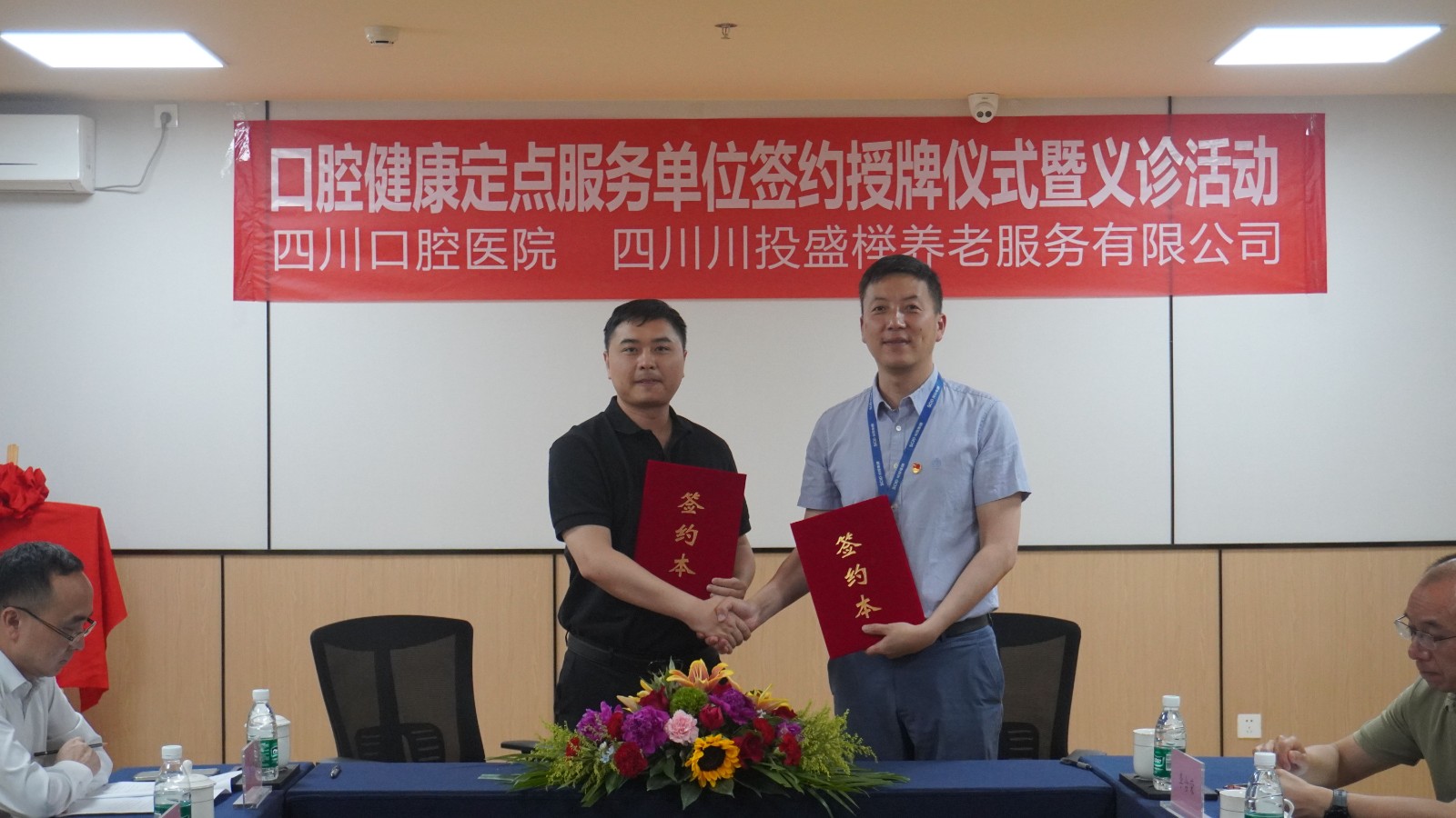 5月15日,川投盛榉公司与四川口腔医院在川投舒适之家·武侯吉福院举行支部共建协议及口腔健康定点服务单位签约授牌仪式暨口腔义诊活动。武侯区晋阳街道党工委委员、吉福社区党委书记李含荣,川投大健康产业集团党委副书记、职工董事、工会主席王少甫,华西牙科副总经理李景雨出席仪式。