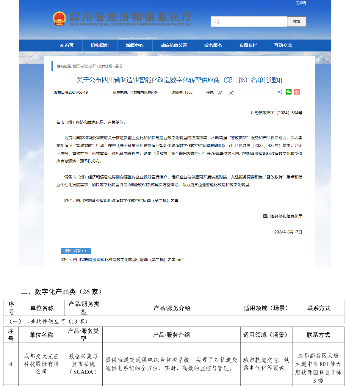 6月19日,四川省经济和信息化厅网站公布四川省制造业智能化改造数字化转型供应商(第二批)名单,川投能源所属交大光芒公司作为数字化产品类工业软件供应商入选四川省制造业智能化改造数字化转型供应商资源池。