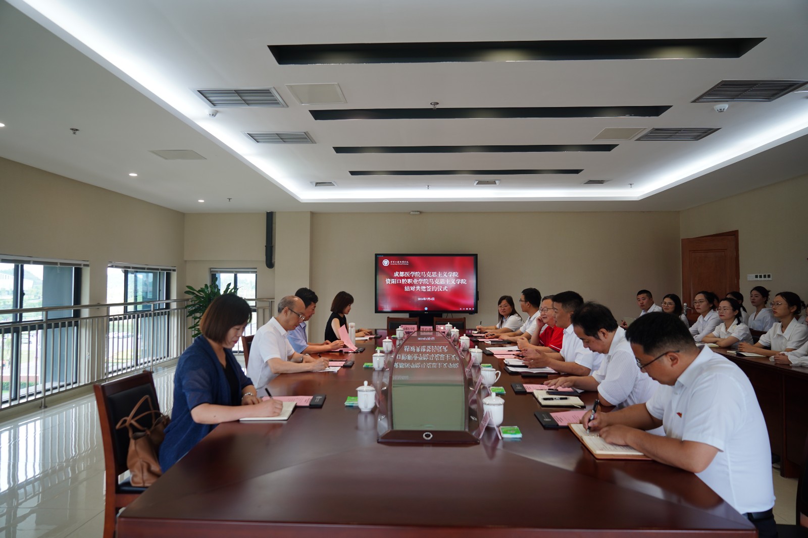 为深入贯彻习近平总书记关于思想政治理论课建设的重要论述,认真落实中共四川省委教育工委、四川省教育厅关于开展四川省高校马克思主义学院结对共建行动的文件精神,进一步推进马克思主义学院高质量建设,近日,成都医学院与资阳口腔职业学院签订结对共建马克思主义学院协议。成都医学院马克思主义学院院长张俊、党总支书记张首先,学院党委书记、理事长张中伟,院长万呼春、马克思主义学院执行院长陈思俊出席会议,学院各部门负责人、全体思政教师参加。