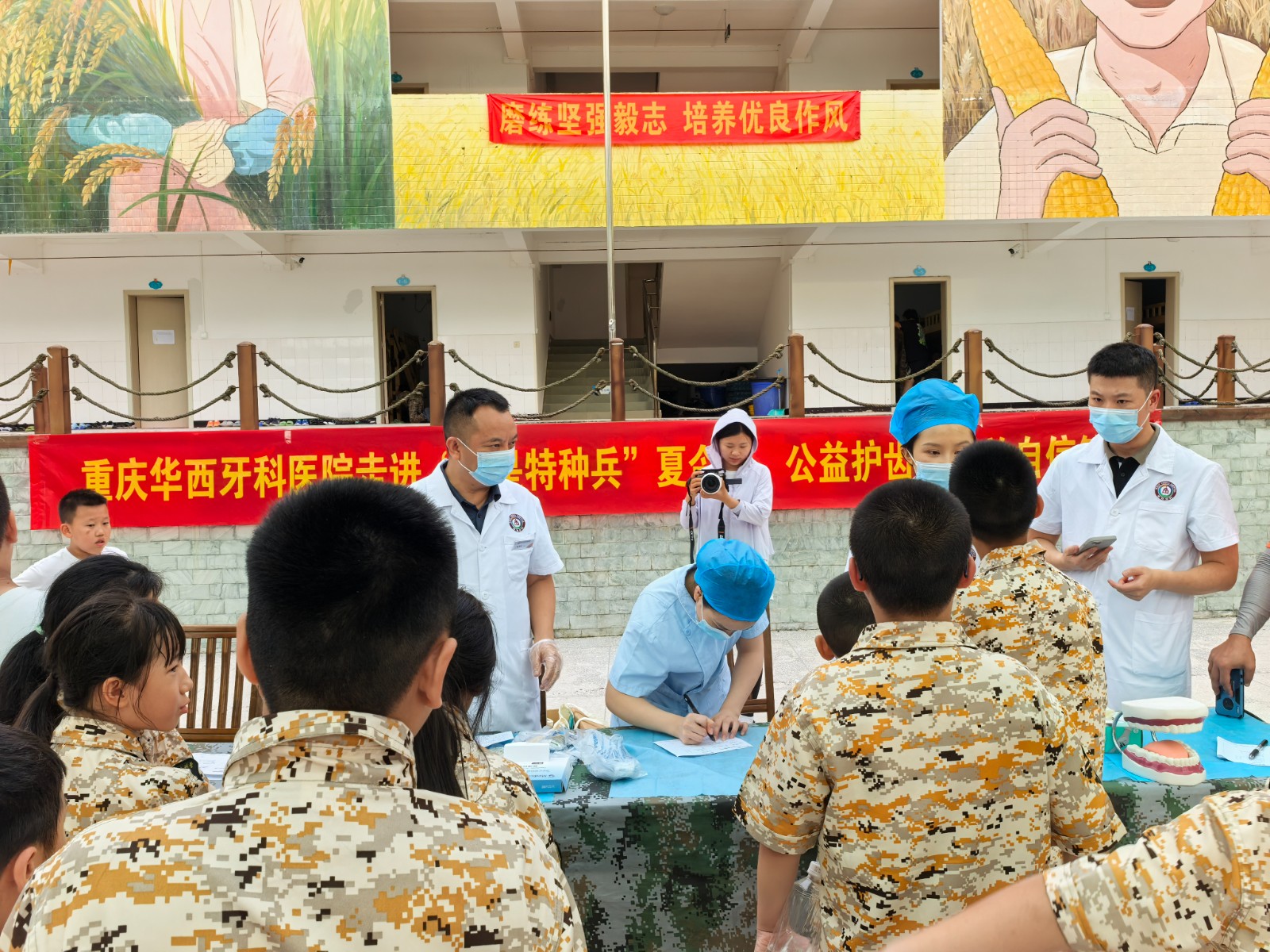 7月18日,重庆华西牙科医院爱牙公益行走进“我是特种兵”夏令营,为营区内的120名孩子免费检查口腔健康情况。
