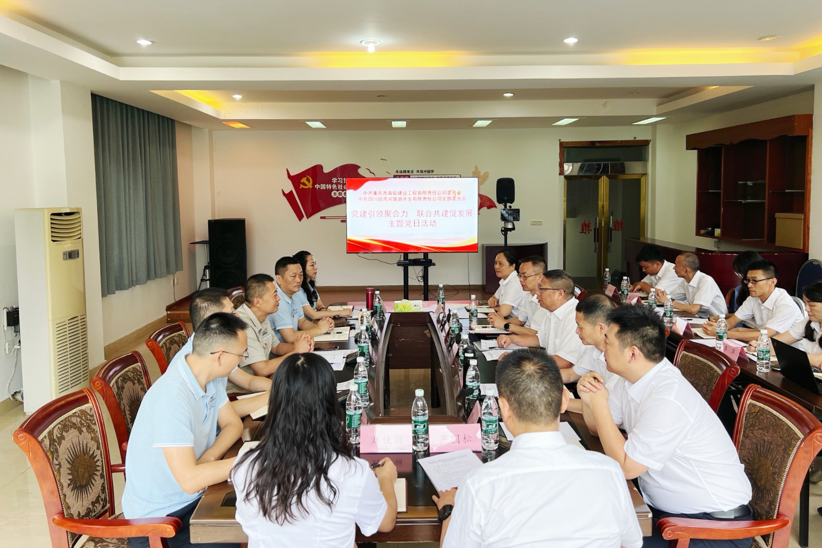 为深入学习贯彻党的二十届三中全会精神,进一步发挥党建引领作用,推动党建工作与项目建设深度融合,7月26日,川投田湾河所属旅游公司党支部与重庆西南铝建设工程有限责任公司党委在草科温泉特色小镇开展了一场以“党建引领聚合力,联合共建促发展”为主题的联合共建主题党日活动。本次活动由川投田湾河党委副书记、总经理,旅游公司党支部书记、董事长杨超龙主持。西南铝建设公司党委书记、董事长兼总经理罗晓东出席活动,双方党员及入党积极分子参加了此次活动。