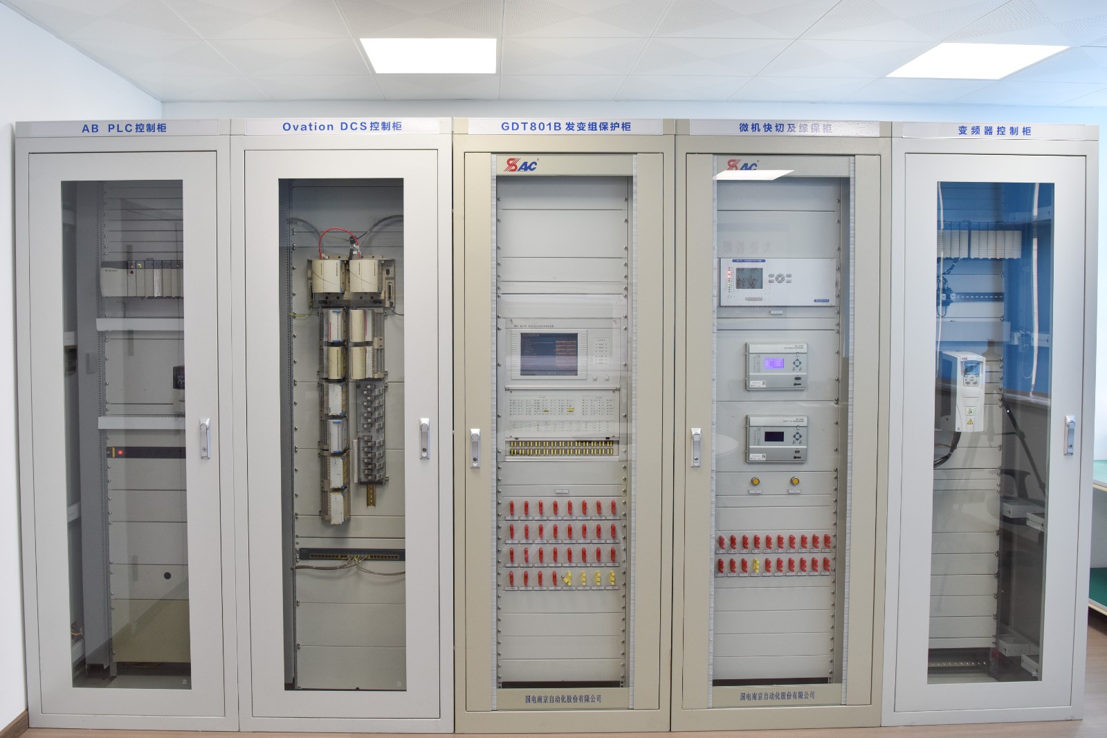 培训室主要设置了机组DCS控制系统、发变组保护、PLC、微机快切及综合保护装置和变频器五面培训柜。这些系统设备集成度高,技术复杂,均为火力发电厂电气、热控两个专业的主要核心技术。由于运行中较难维护,且影响面大,风险高,技术人员平时能动手操作、练习机会很少。联合培训室的建成,将生产现场的电、热核心技术模块搬到培训室,增加了员工上手操练机会,为电热专业核心技术人才的培养创造了良好条件。