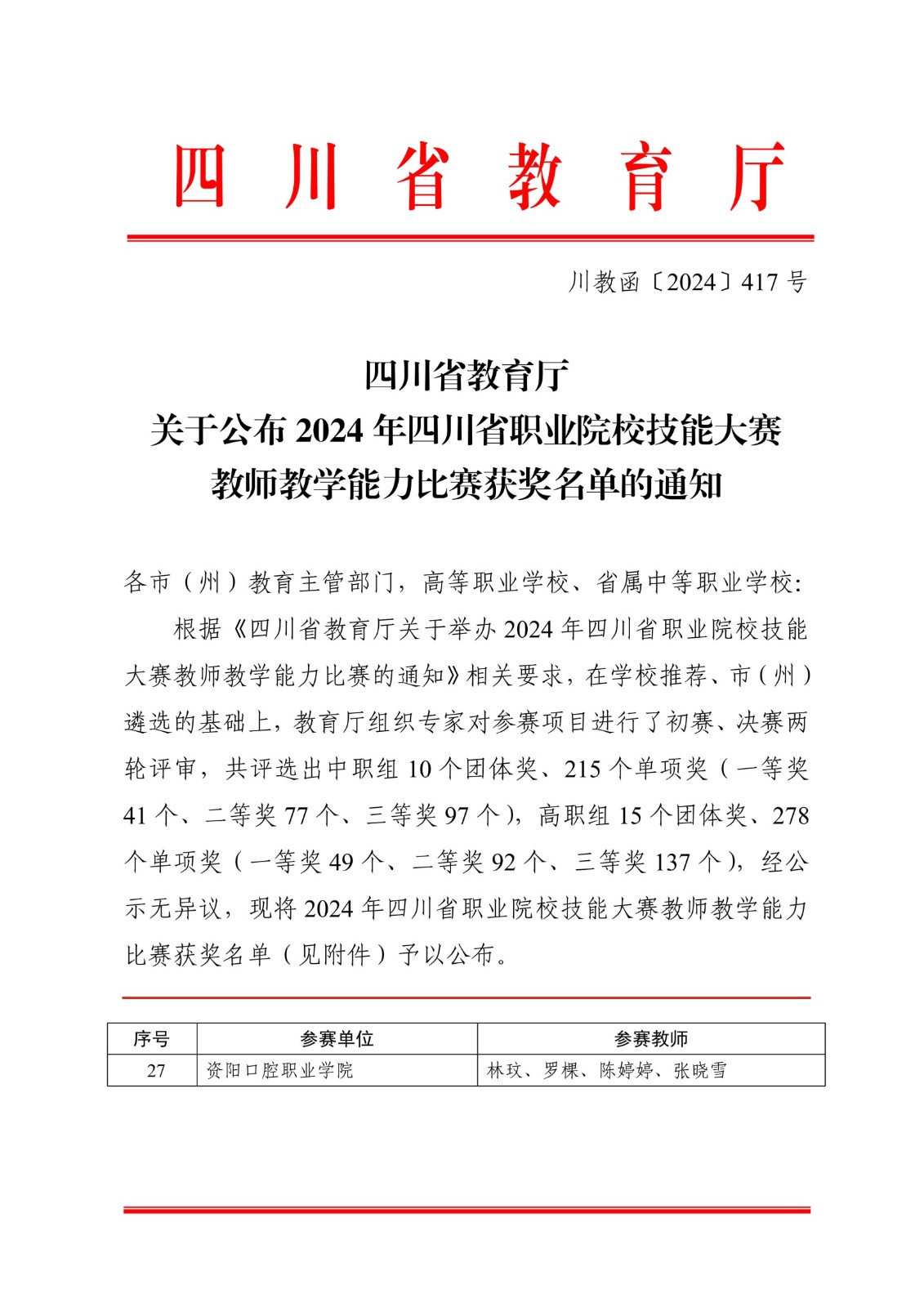 近日,2024年四川省职业院校技能大赛教师教学能力比赛决赛圆满落幕。今年,全省高职院校有500余支参赛队伍参赛,经过初赛,141支教师团队进入决赛。资阳口腔职业学院唯一一支参赛团队(中医护理教师团队:林玟、罗棵、陈婷婷、张晓雪)顺利入选省级决赛,荣获专业课程二组二等奖,实现了学院在该项重要赛事上获奖数量和质量的历史性突破,彰显了学院作为民办高校在全省职业教育领域的影响力。