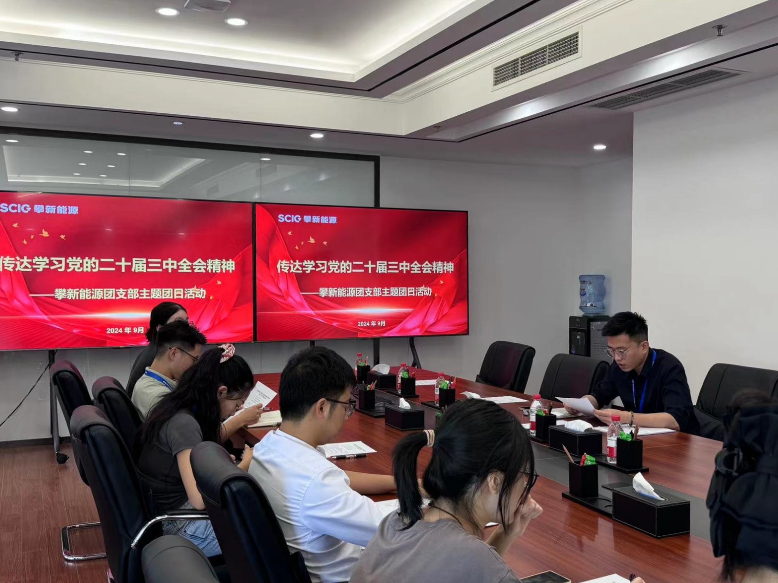 近日,川投能源所属攀新能源公司团支部举行2024年9月主题团日活动,专题传达学习《中国共产党第二十届中央委员会第三次全体会议公报》,学习贯彻党的二十届三中全会精神。攀新能源团支部书记、经营管理部经理潘鑫主持并领学,公司全体团员及屏山抽蓄公司全体团员参会。