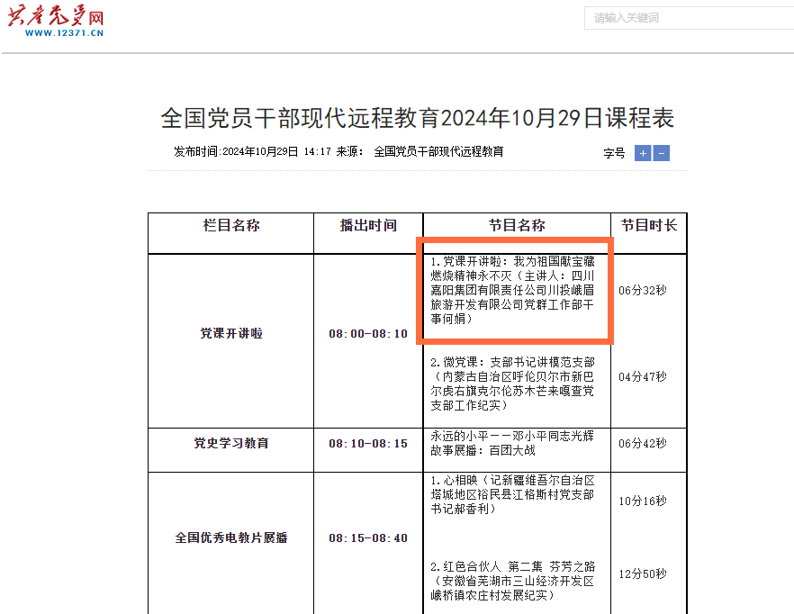 10月29日,由中共中央组织部主管、中央组织部党员教育中心主办的共产党员网公布全国党员干部现代远程教育课程表,嘉阳集团微党课《我为祖国献宝藏 燃烧精神永不灭》精彩亮相,用6分32秒的时长为全国的党员们呈现了难忘的一课。