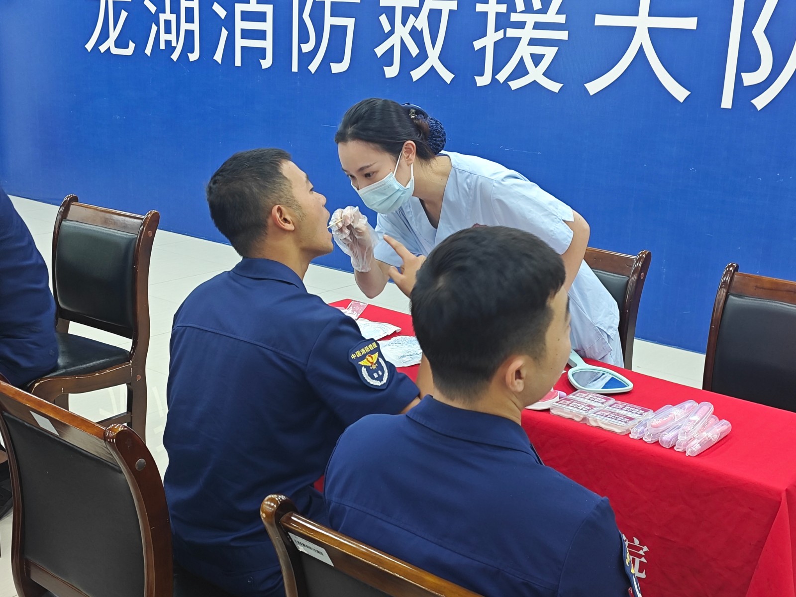 签约仪式现场,汕头口腔医院专家团队为消防员们进行了口腔科普宣教活动,口腔专家向消防员们展示了龋齿、牙周病、牙缺失等牙齿问题治疗前后对比的真实案例,分析问题成因及防治方法,随后向他们演示巴氏刷牙法的正确步骤和口腔日常护理要点,帮助他们养成良好的口腔卫生习惯。活动现场,专家团队还为消防员们进行一对一的口腔检查和咨询服务,为他们提供了从口腔卫生、生活习惯、日常饮食等多方面的有针对性的防治建议。