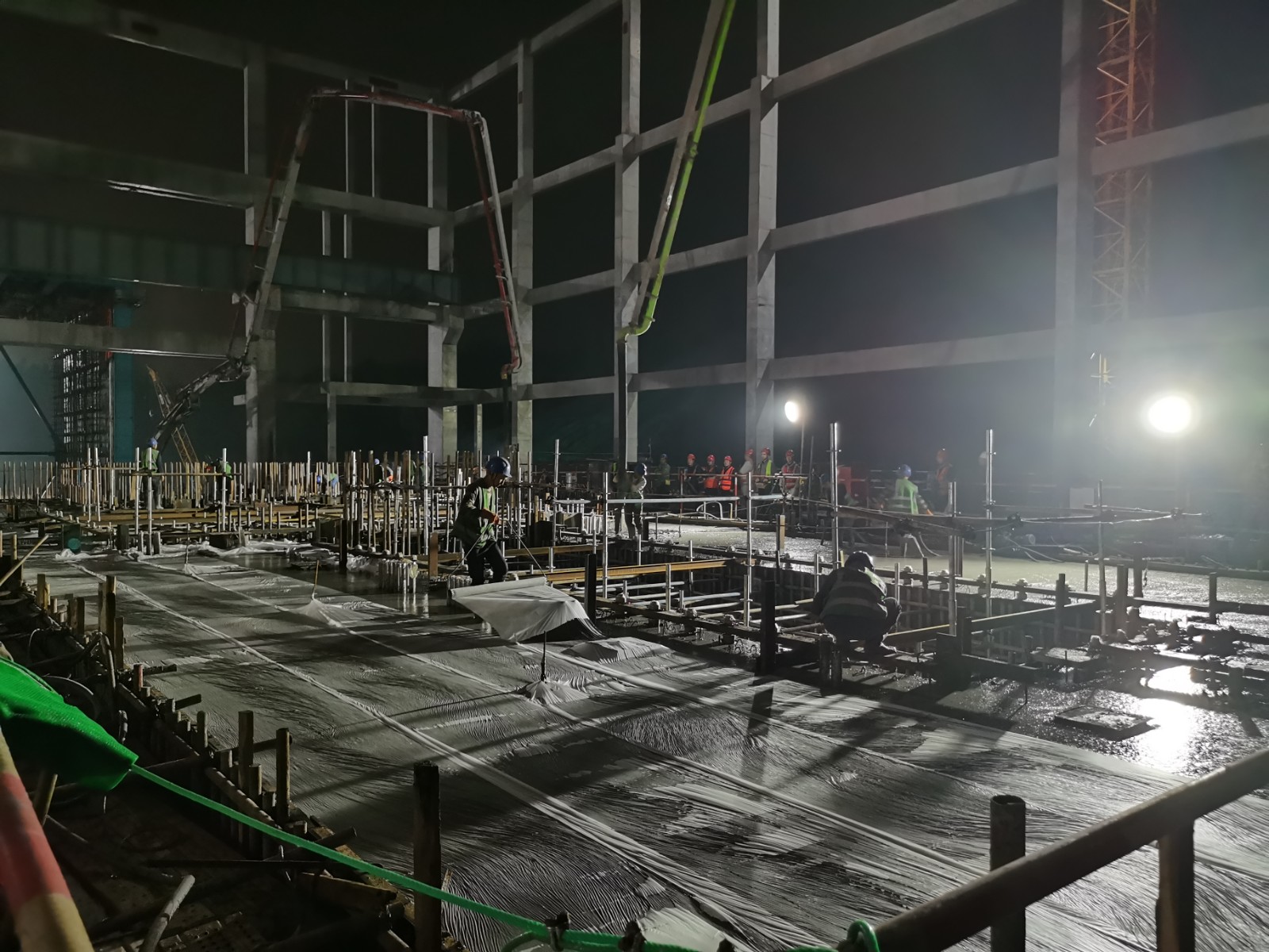 自2023年11月30日达州气电二期工程开工以来,项目共进行了12次大体积混凝土浇筑,涉及余热锅炉本体及烟囱筏板基础、燃汽机岛底板、燃机10.27米层、汽机14.95米层基础等,累计浇筑混凝土量约14500m³,耗时约150小时。其中,本次燃汽机岛底板的浇筑量最大,高达2900m³,需要连续浇筑28小时,混凝土运输190余车次。