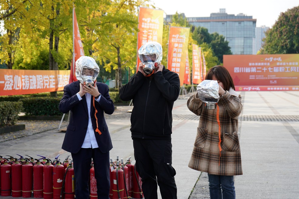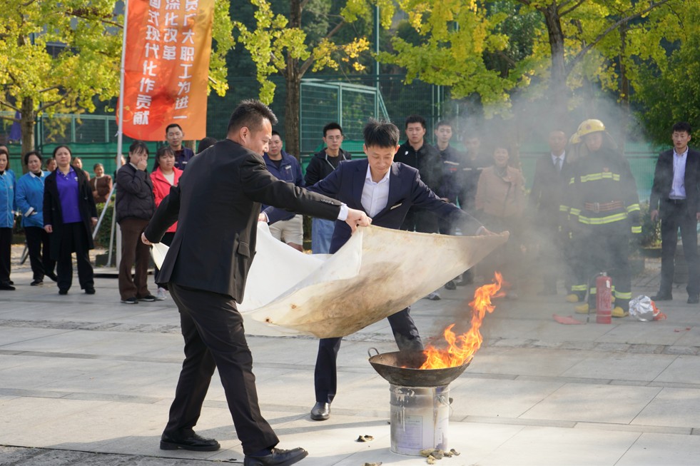 本次演练以公司综合馆2楼模拟发生火情为情景,公司及时启动应急救援预案,成功扑灭火情并疏散被困人员到安全区域。工作人员详细讲解、演示了过滤式呼吸面罩、灭火器、灭火毯等常见消防器材的使用方法,参演人员现场学习后,纷纷上前体验了灭火器和灭火毯的实际操作。