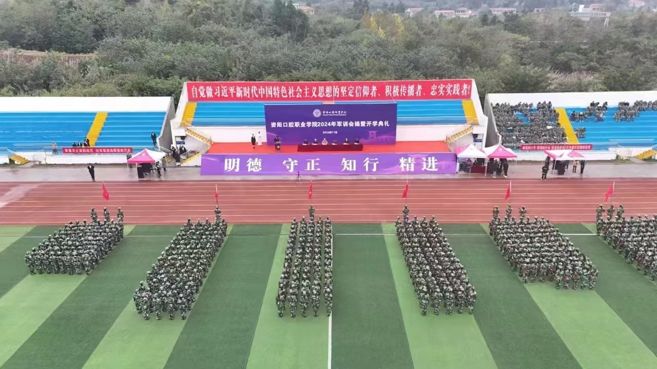 近日,资阳口腔职业学院隆重举行2024年军训会操暨开学典礼。经过15天的刻苦训练,来自全国各地的1387名2024级新生以激扬嘹亮的口号、昂扬向上的风貌、雄壮豪迈的步伐汇报了军训成果,共同开启青春新征程。资阳市雁江区人民武装部副部长杜文斌,学院在家领导班子出席典礼,各职能部门主要负责人,2024级全体新生、辅导员、军训教官参加。