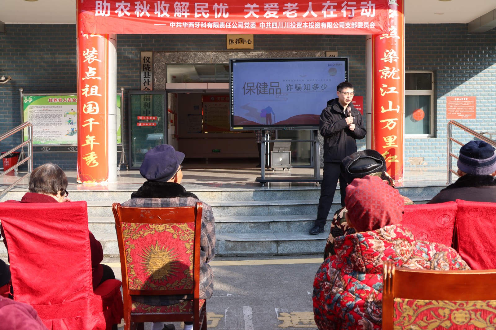 29日上午,帮扶人员来到仪陇县老年养护院,围绕“认识保健品知识”“购买保健品注意事项”“保健食品广告”等内容开展保健品反诈宣传讲座,引导老年消费者科学认知和理性消费保健品,防范养老诈骗,并为150位老人送去过冬棉袜,传递冬日温暖。