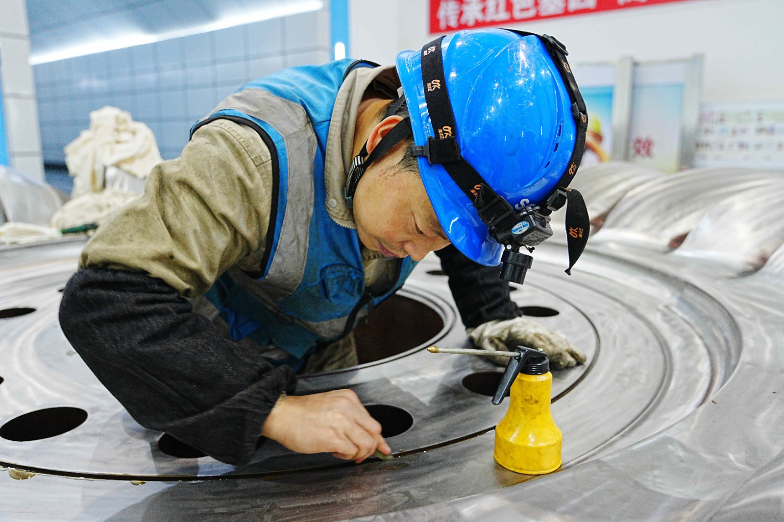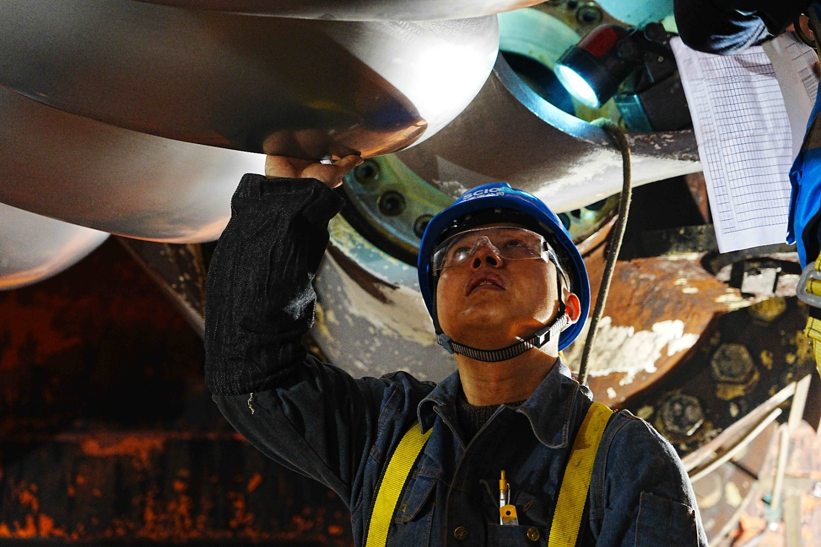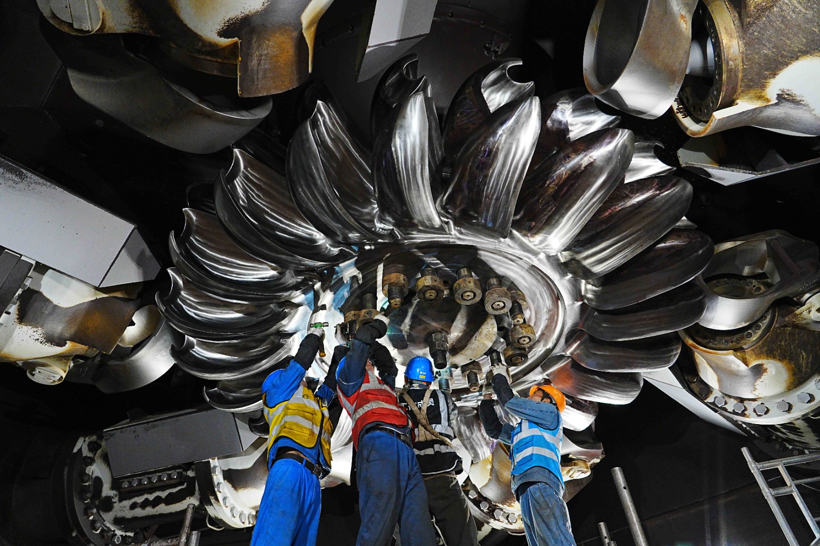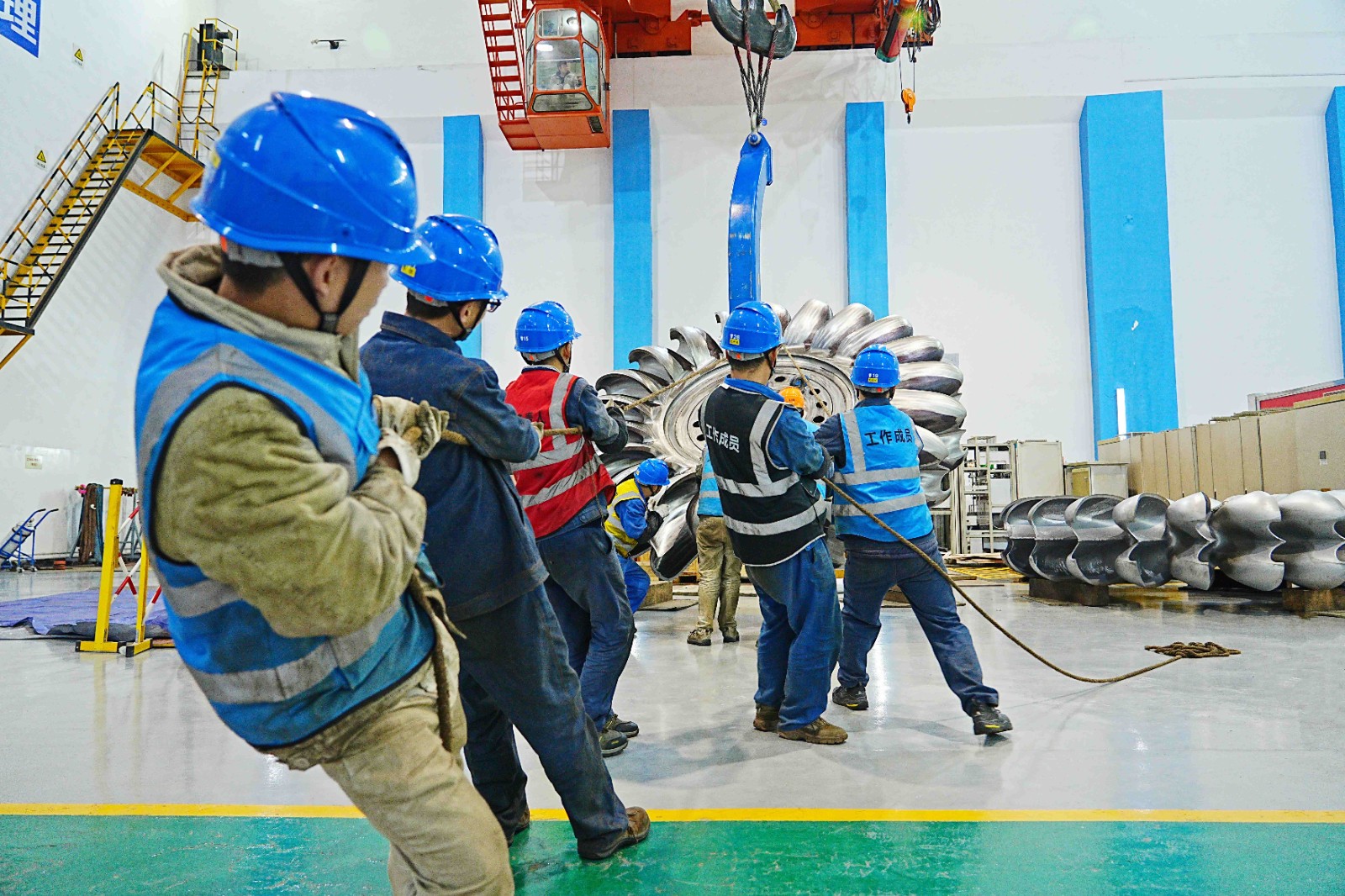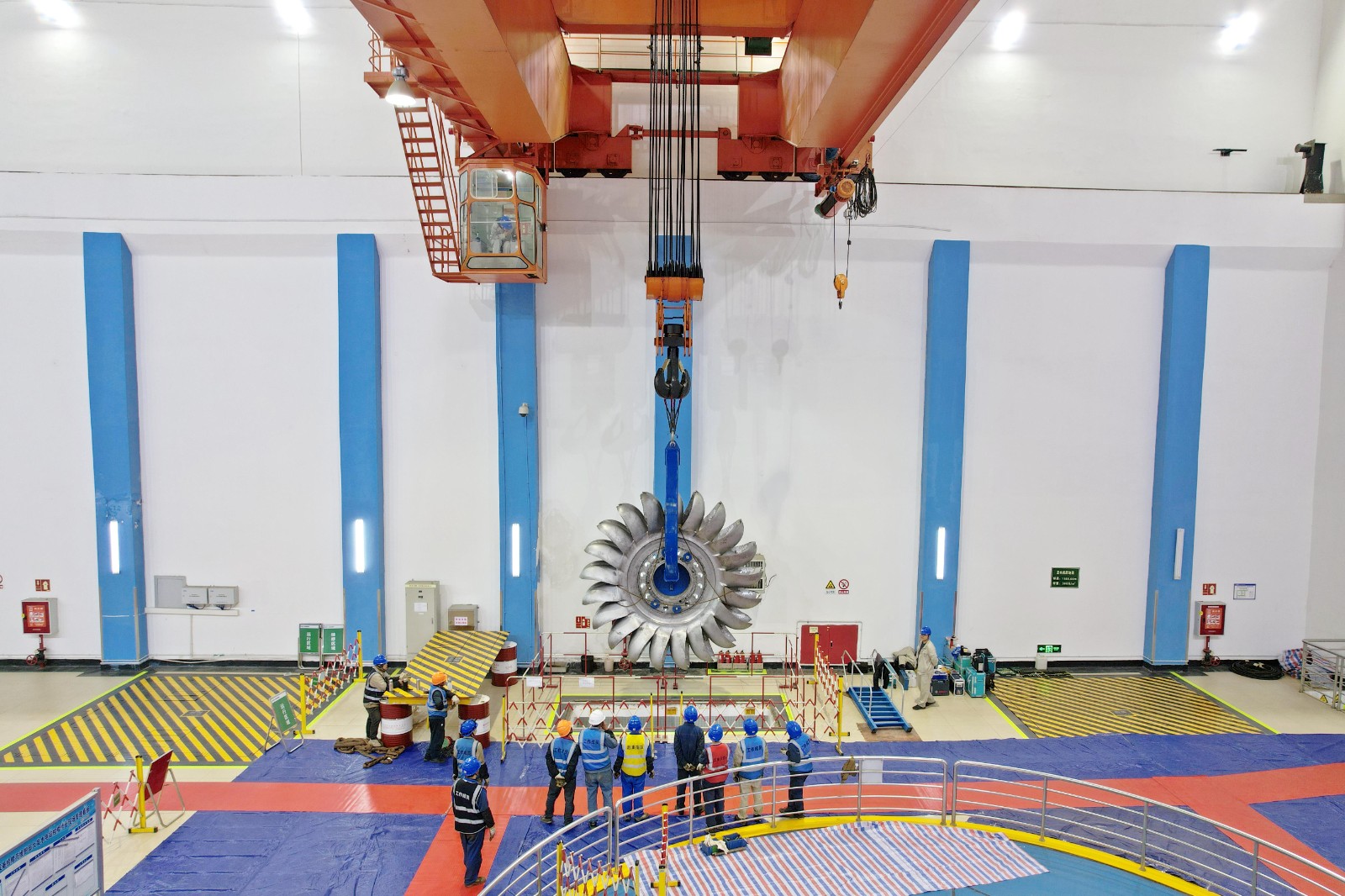 12月2日,转轮更换作业正式开始,拆卸门板、拉伸螺栓、转轮下放,每一项工作都有条不紊地推进。在专用工具的加持下,现场的转轮翻身更成为一道亮丽的风景线。全体作业人员各司其职、紧密协作,克服环境温度低、液压拉伸器安装对位难等诸多难题,经过近8天的全力奋战,最终实现本次转轮更换工作安全圆满完成。