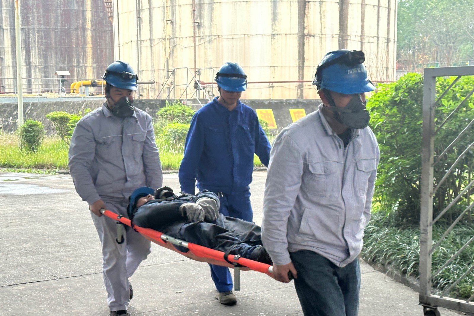 应急演练模拟了“工作人员在公司燃油泵房地沟内检查燃油管道腐蚀情况时,现场有毒有害气体检测装置突然报警,一名工作人员窒息晕倒”的危急情况。现场监护人员立即汇报运行当班值长、队长和部门负责人,并立即启动应急救援预案,组织开展救援。救援过程中,施救人员正确佩戴正压呼吸器及救生绳等安全防护用品后实施救援,成功将伤员救出并及时转移,演训达到了预期效果。