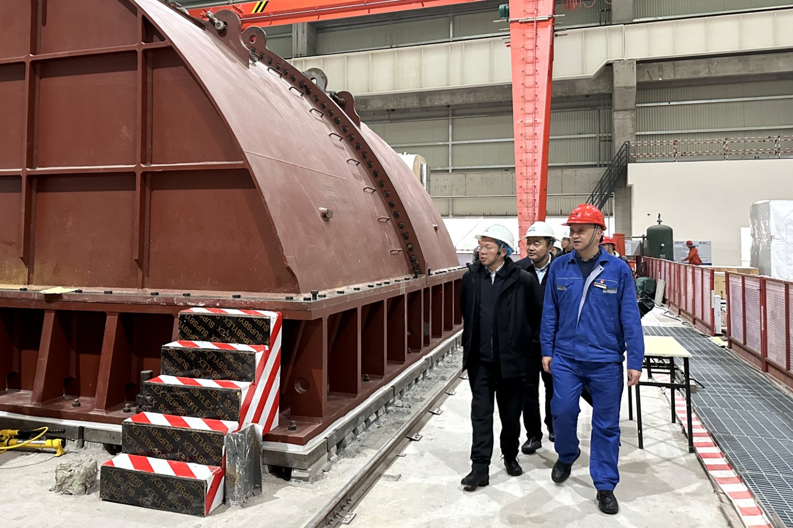 高剑一行在泸州气电董事长、总经理陈嵩陪同下,深入川投泸州天然气发电项目施工现场,实地查看了主厂房、余热锅炉、机械通风冷却塔、GIS等施工区域,详细了解项目主体工程与配套工程建设进展、设备到货与安装以及安全环保管理措施落实等工作情况。