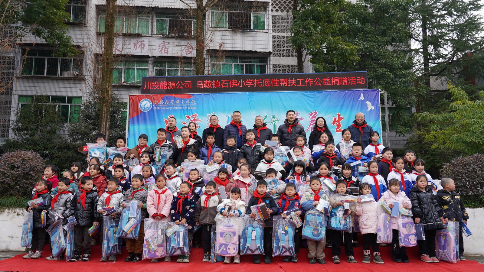 在马鞍镇石佛小学,杨洪等领导为贫困学生送上体育器材、文化用具等学习生活用品,勉励孩子们要从小树立远大的志向,勇敢面对困难,在逆境中坚持不懈地奋斗,努力成长为德才兼备的优秀学生,以实际行动感恩家庭的养育之恩,回馈社会的关爱之情。