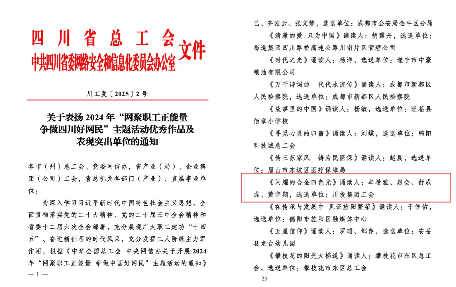 近日,由四川省总工会、四川省委网信办联合开展的“网聚职工正能量 争做四川好网民”2024年四川省网络正能量诵读作品征集活动评选结果揭晓,川投峨铁公司创作的诵读作品《闪耀的合金四色光》获评“2024年网络正能量优秀诵读作品”。