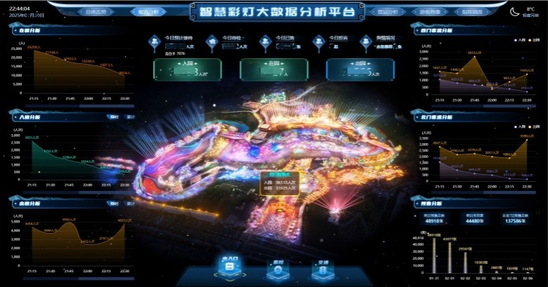 在自贡灯会的智慧化建设中,大数据分析系统扮演了至关重要的角色。通过数据中心所收集的数据,景区管理人员可快速了解园区内实时入园、出园、在园数据以及快速实现接待分析、售票数据分析、客源地分析、瞬时客流分析等功能。这些数据不仅为景区的日常运营提供了有力支持,还为未来的市场拓展和运营决策提供了有力数据支撑。