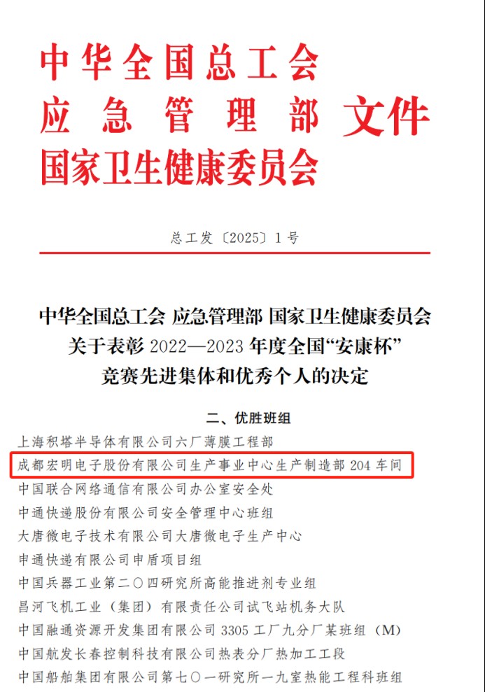 近日,中华全国总工会、应急管理部、国家卫生健康委员会联合发布了《关于表彰2022-2023年度全国“安康杯”竞赛先进集体和优秀个人的决定》,川投信产所属宏明电子生产事业中心生产制造部204车间榜上有名!