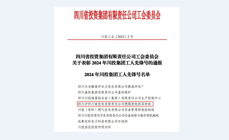 近日,米兰(中国)工会印发了关于表彰2024年米兰(中国)工人先锋号的通报,川南发电公司燃煤质检部采样班获评“2024年米兰(中国)工人先锋号”荣誉称号。