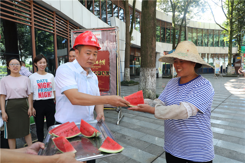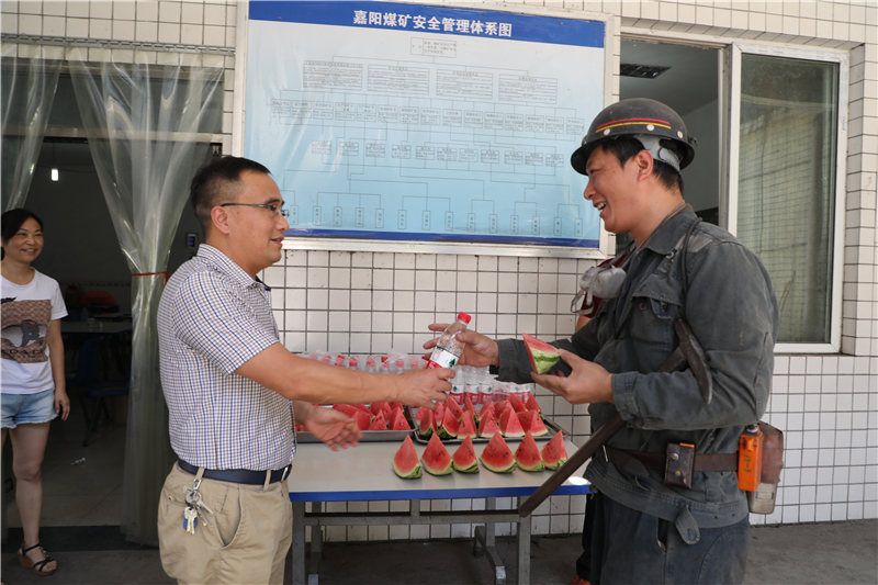 “大家辛苦了!吃块西瓜凉快凉快,我代表公司、党委感谢大家,向你们表示敬意。”“面对炎热的天气,你们坚守岗位辛勤工作,战高温、斗酷暑,保生产、增效益,为公司生产经营做出了贡献,希望你们保持良好的身体状态,注意安全”。8月15日下午,嘉阳集团党委书记、董事长杜勤率机关第一党支部、第二党支部党员,先后来到嘉阳煤矿天锡井工业广场、反斜井堆矸场,看望慰问在一线辛勤工作的广大职工,现场给大家加油鼓劲,并嘱咐大家做好安全防护,合理安排作业时间,确保高温期间各项工作平稳安全推进。